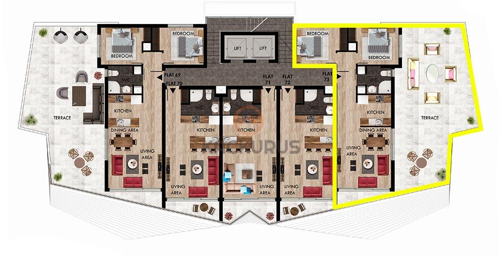 Özel mimarisi ve her daireden eşsiz Akdeniz manzarasına hakim konumuyla dikkat çeken lüks site, altın kumu ve berrak deniziyle adanın en uzun ve en popüler kıyısı olan Long Beach sahiline sadece 550 metre yürüme mesafesinde yer alıyor. Satılık dairemizin 69.5m2 balkon alanı bulunmaktadır.