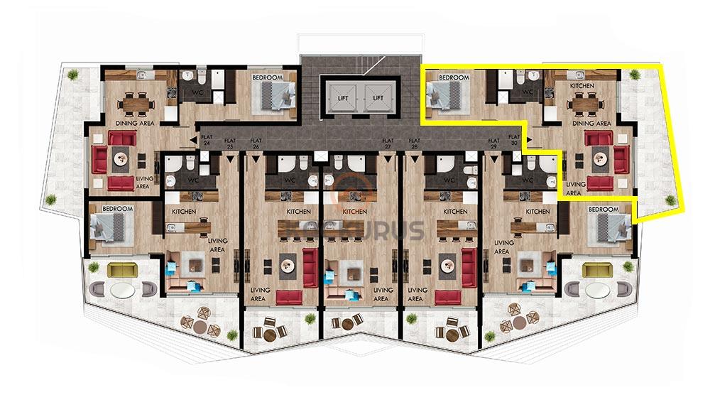Die exklusive Architektur und die einzigartige Aussicht auf das Mittelmeer von jeder Wohnung aus machen unser 1+1 Apartment mit 78m2 besonders attraktiv. Es liegt nur 550 Meter vom Long Beach entfernt, dem längsten und beliebtesten Strand der Insel. Die Wohnung verfügt über einen 17m2 großen Balkon.