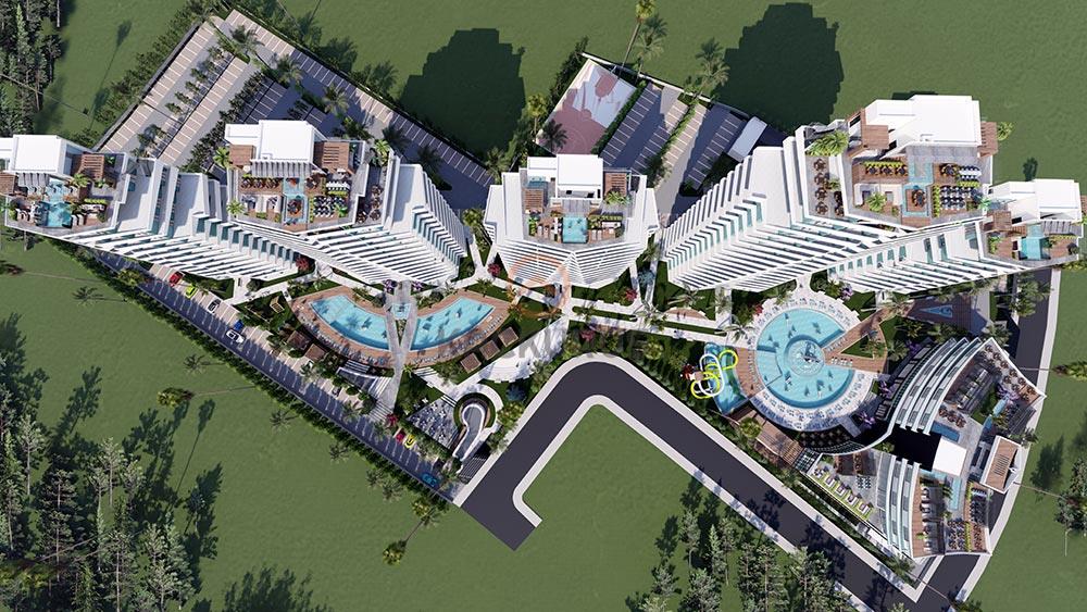 Projekt obejmuje 2,5-hektarową powierzchnię z łączną liczbą 416 jednostek mieszkalnych — od studiów po apartamenty 1+1, 2+1 i apartamenty typu suite 3+1. Wśród udogodnień znajdują się: hotel, strefy relaksu i spacerowe, aquapark, cztery baseny (w tym dwa dla dzieci), nowoczesna siłownia, dwa restauracje (jedna à la carte), pool bar, taras bar, amfiteatr wielofunkcyjny, parking w każdym bloku, mini golf, boisko wielofunkcyjne, plac zabaw, market, sklep z pamiątkami, bankomat oraz całodobowy monitoring i ochrona.