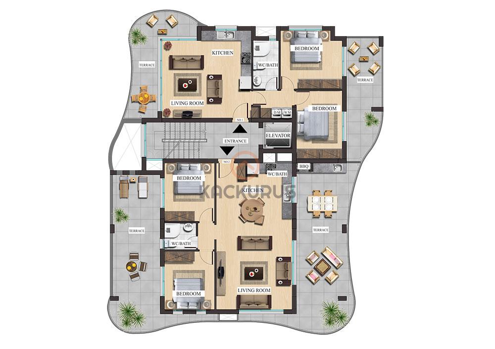 الشقة 2+1 تتكون من 1 صالة و 2 غرفة نوم بمساحة 104.5 م2. تحتوي شقة البنتهاوس 2+1 للبيع على واجهة تطل على الطريق.