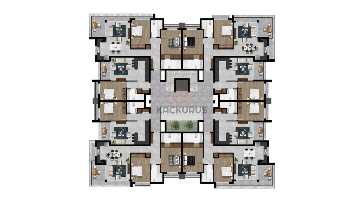 - 5. Kat: 4 daire (2+1) + 4 daire (1+1) – özel çatı teraslı