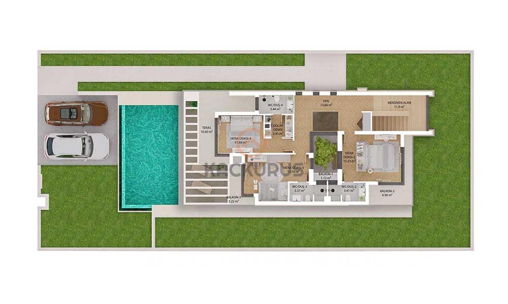 - C Tipi Ultra Lüks Satılık Villamız 4+1 ve havuzludur, toplam 246 m²’dir.