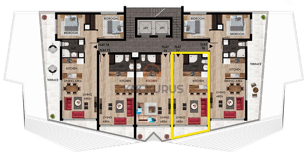 Özel mimarisi ve her daireden eşsiz Akdeniz manzarasına hakim konumuyla dikkat çeken lüks site satılık stüdyo daire, altın kumu ve berrak deniziyle adanın en uzun ve en popüler kıyısı olan Long Beach sahiline sadece 550 metre yürüme mesafesinde yer alıyor.
